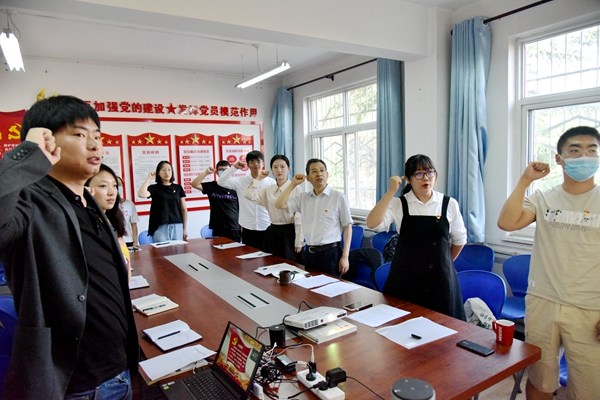 “我志愿加入中国共产党,拥护党的纲领……”报告结束后,全体党员面对鲜红的党旗重温入党誓词。阮鹏希望每一位学生认真学习优秀党员的先进事迹,并提出三点要求:一是要坚定理想信念。二是要励青春之志。三是要争做模范先锋。