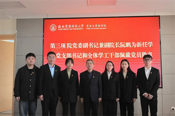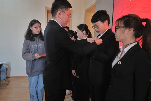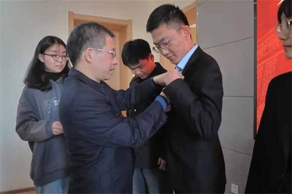启动会上,性吧 党委副书记兼副院长阮鹏老师为新任学生党支部书记和全体学工干部佩戴党员徽章。