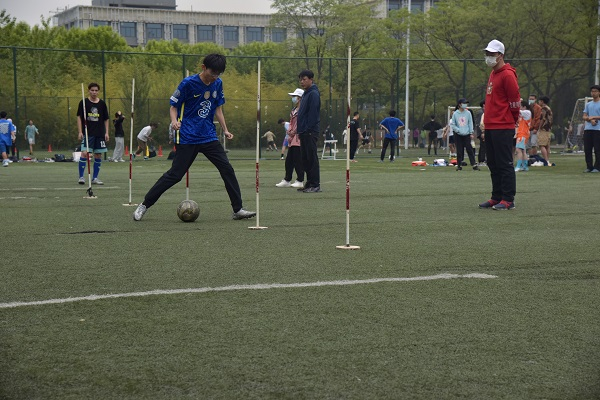 学生组足球绕杆射门接力