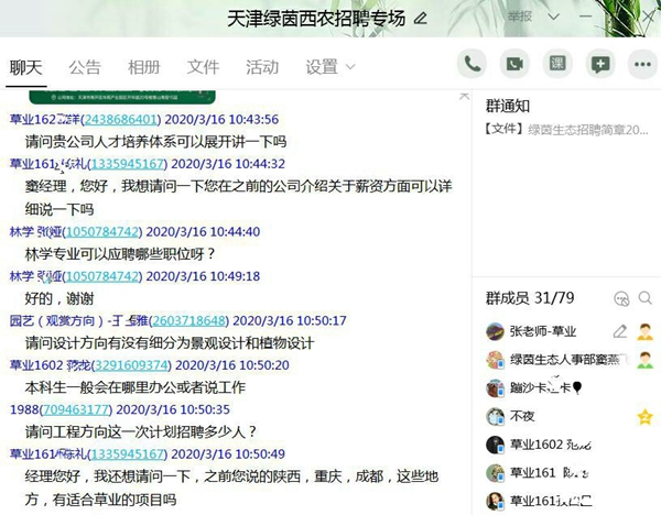 3月16日,性吧 邀约天津绿茵景观生态建设股份有限公司通过“云课堂”成功举办网络云招聘宣讲会,来自草业、园林、林学、经管、植保、水建、机电、人文等性吧 相关专业的近80名学生参加。