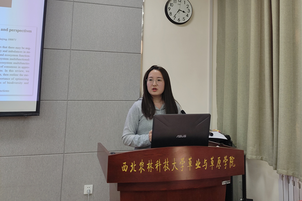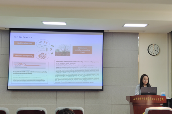 何佳同学作了题为《土壤生物网络结构对生态系统功能的调控作用》的学术报告。在报告中,她分享了两篇自己已发表的文章,详细介绍了土壤微生物的多样性、网络复杂性与多种生态系统功能的关系,强调了共生网络对于微生物多样性的重要性,指出了在退化生态系统恢复中更应考虑土壤生物之间潜在的相互作用,而不是简单地关注物种数量。